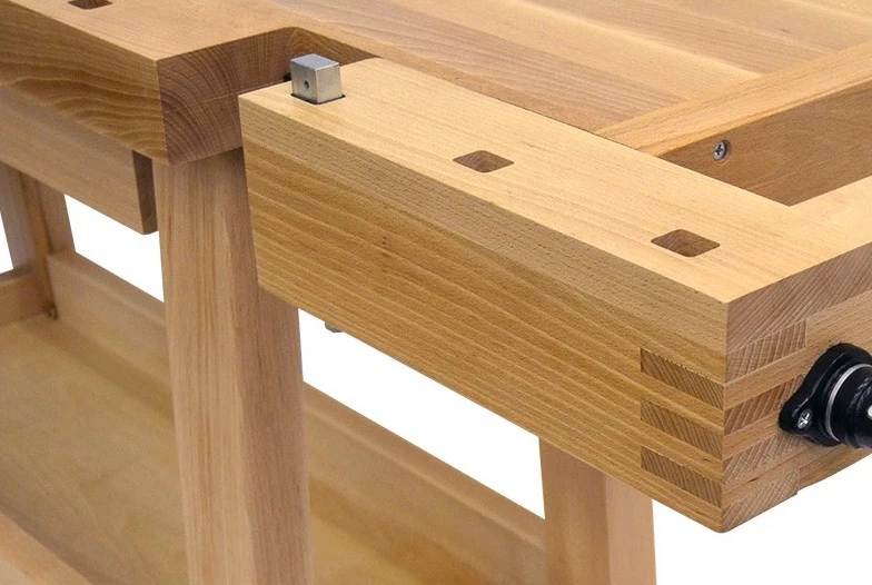 Ce système de boîtier à coulisse permet un serrage très puissant, fluide (sans à-coups) et parfaitement parallèle, en bloquant les pièces de manière classique ou en butée sur toute longueur de l’établi grâce à la paire de poteaux de serrage fournis.