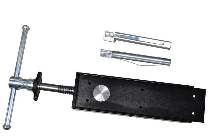 Installée en bout (angle du plateau) d’établi, le mécanisme est basé sur un rail coulissant mis en mouvement par une vis de serrage (tige acier laminé à filetage trapézoïdale Ø 24 mm, PAS de 5 mm).