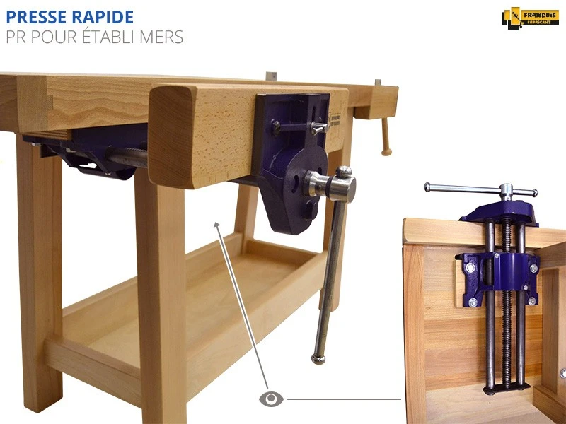 - À l’avant, une presse à serrage rapide. Système de presse à débrayage automatique (approche instantanée du mors par une simple poussée).
